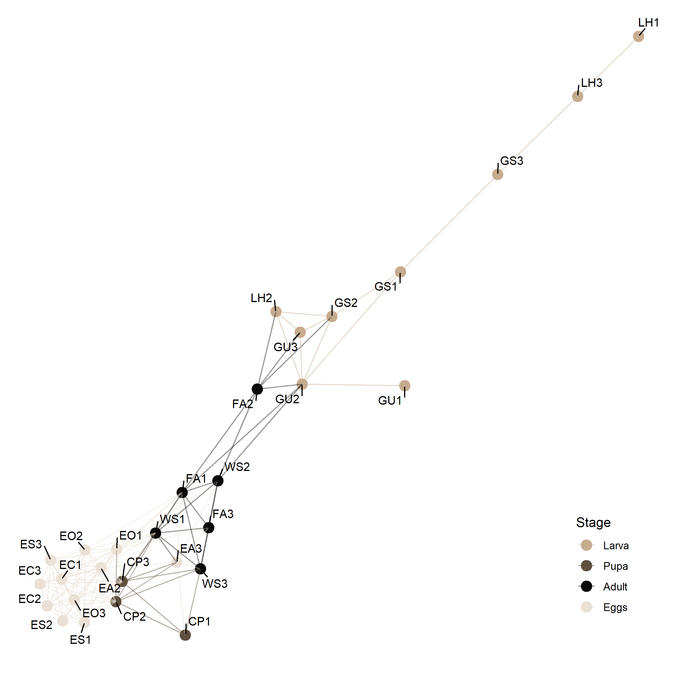 plot_network(ig, ps.rarefied, color = 'Stage', point_size = 4, type = 'samples', label = NA) +